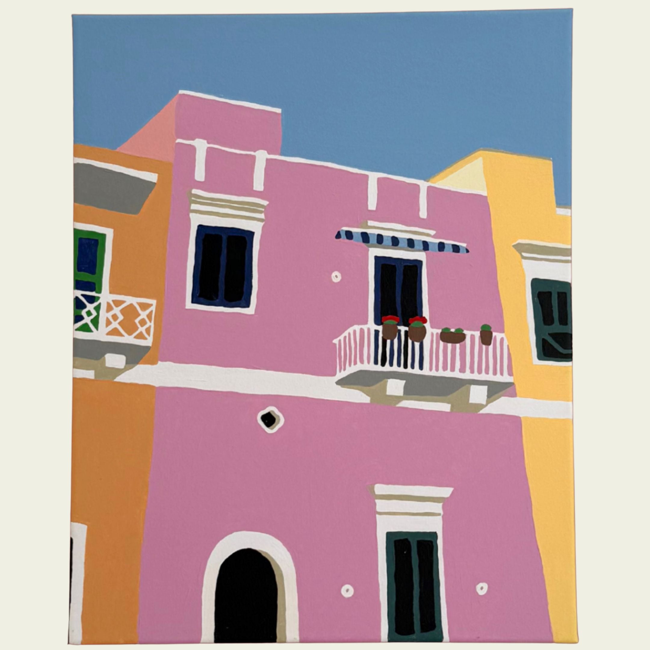 A colourful Puglian streetscape captured on our holiday, featuring pastel façades, bright windows, and sun-washed pink, peach and yellow tones set against a clear blue sky.
